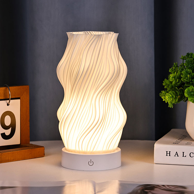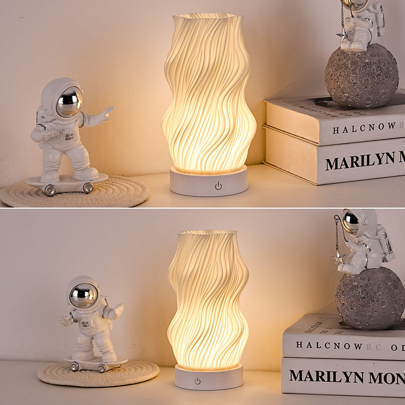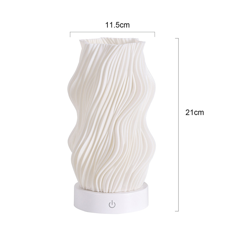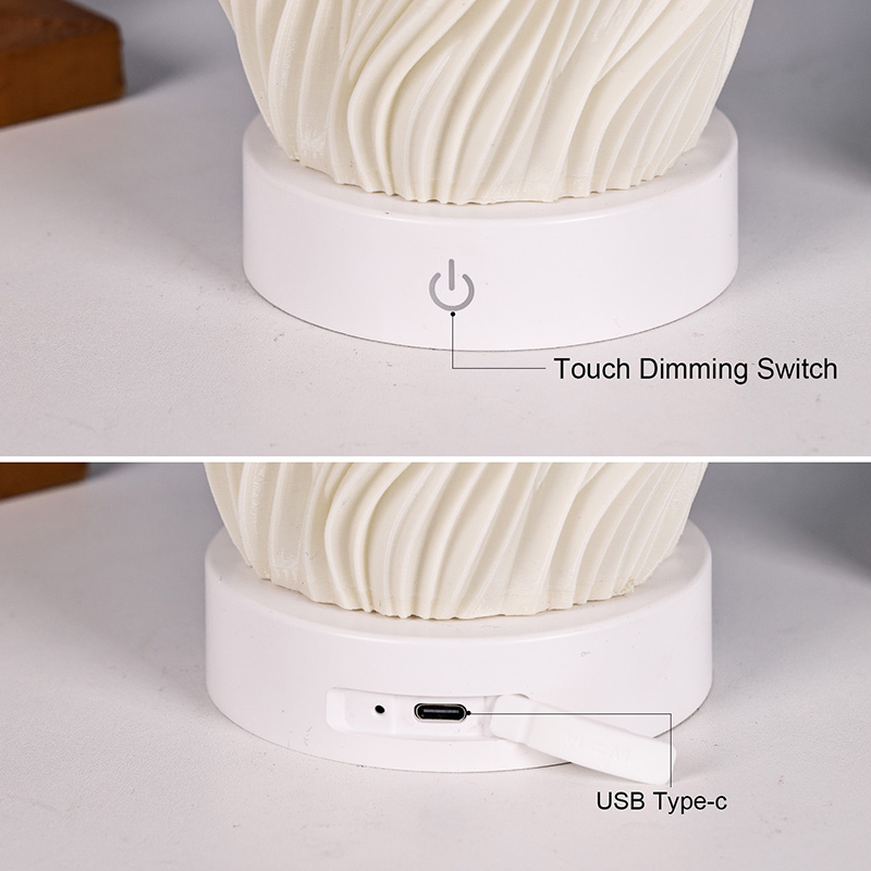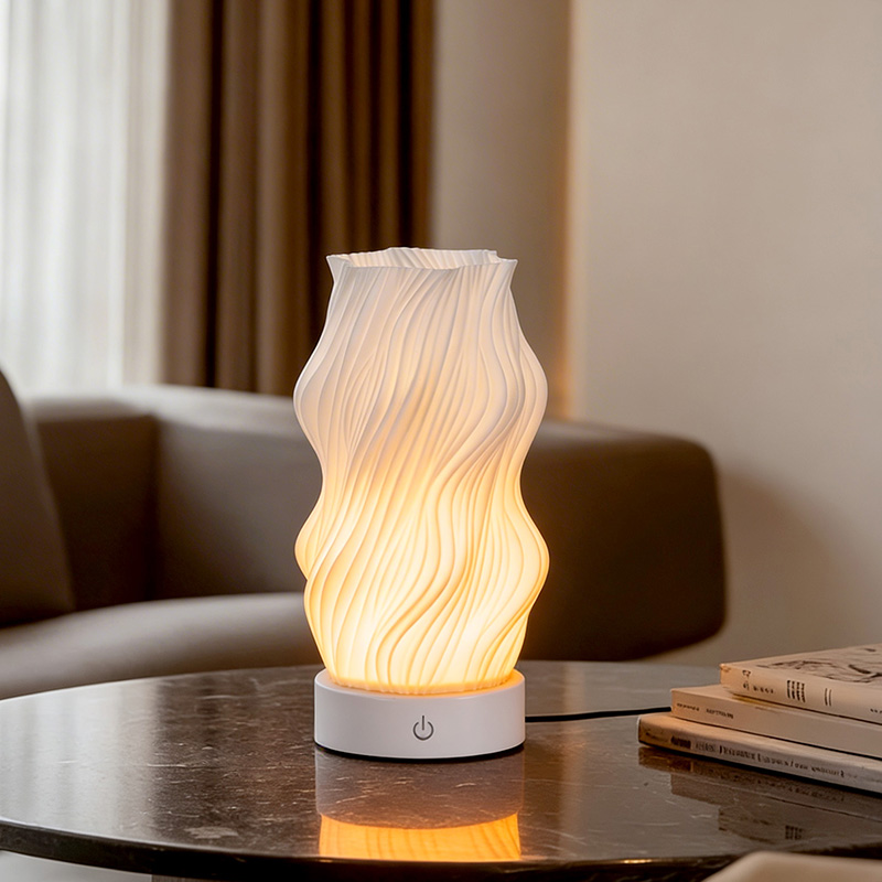 Виготовлений із високоякісного пластику, корпус настільної лампи Flame Night Light є (компактним) і легким. Він не тільки теплий на дотик, але його також легко чистити та переміщати. Мінімалістичний хвилястий дизайн текстури поєднує художню красу з практичністю, легко вписуючись у будь-який стиль домашнього декору. Це ідеальний акцент, який заощаджує простір і додає вашій кімнаті нотку елегантності.