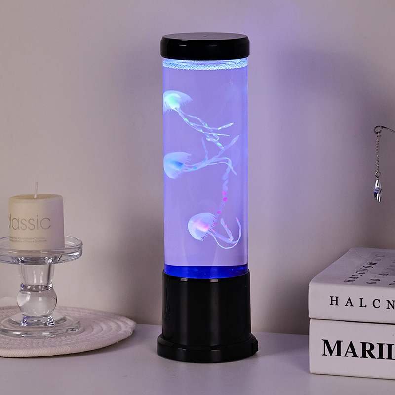 Елегантний дизайн і натхненний природою Світлодіодний світильник із зображенням медузи високого розміру має високий, тонкий циліндр, виготовлений із високоякісного прозорого акрилу, який забезпечує кристально чітку видимість витонченої медузи всередині. Поміщені в ніжно-блакитне рідке середовище, три реалістичні медузи м’яко плавають і пульсують, їхні напівпрозорі тіла підсвічуються динамічними різнокольоровими світлодіодами. М’яке сяйво змінюється спектром заспокійливих відтінків — від блакитних і фіолетових до ніжно-рожевих і зелених — імітуючи біолюмінесценцію, яку можна знайти в реальному глибоководному середовищі. Верх і основа лампи виконані з глянцевого чорного пластику, що надає їй сучасного мінімалістичного вигляду, який доповнює будь-який стиль декору.