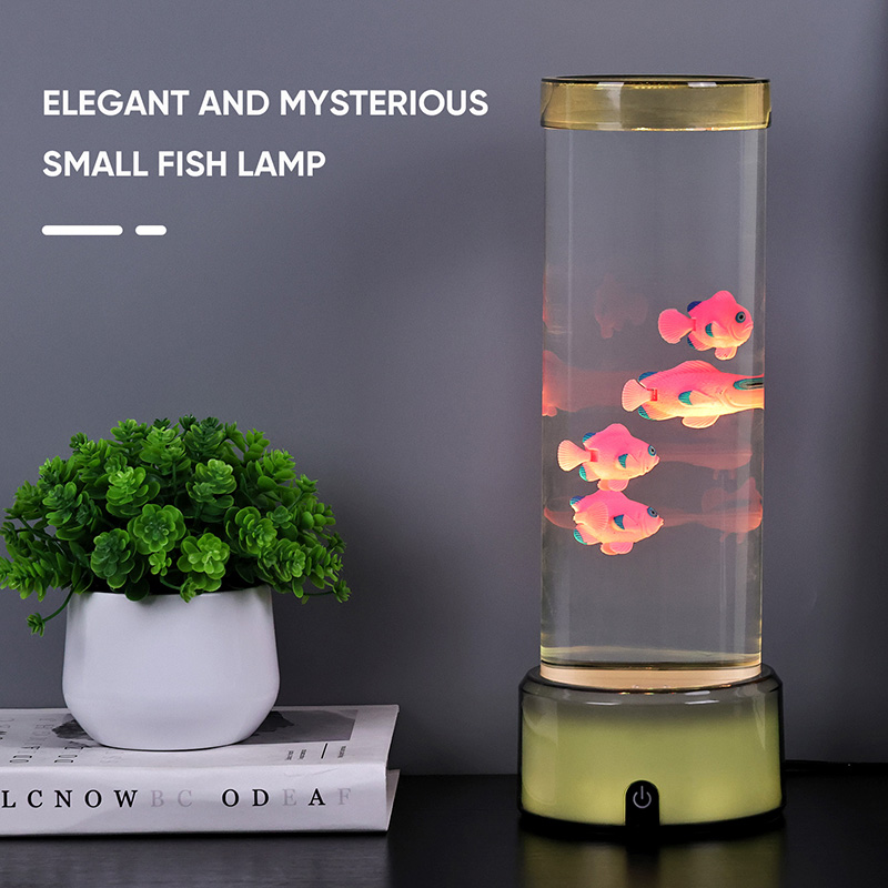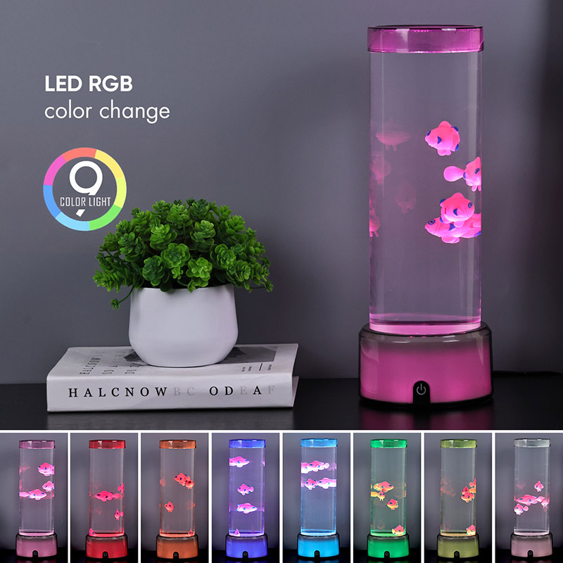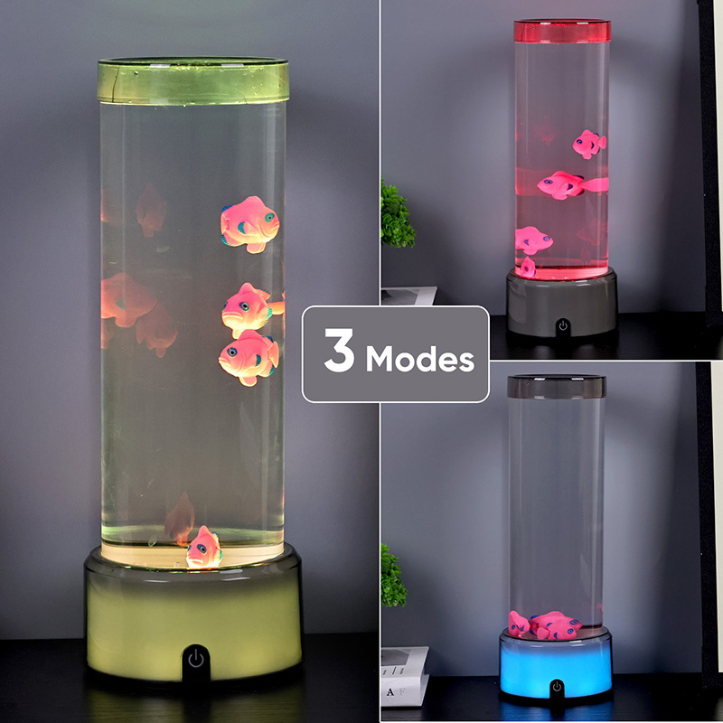 Торкніться перемикача вибору й медуза попливеЛампа «Медуза-риба» з декоративною лампою на базі RGB — це нова дитяча іграшка для огляду з циліндричною формою для утримання води. Після заповнення водою всередину поміщають три рибки. Лампа «Медуза» з основою RGB може плавати вгору та вниз, коли обертається маленький двигун у нижній частині. При цьому основа має трансформацію кольору RGB. Найбільшою особливістю цього продукту є те, що основа також змінюється разом із зміною кольору. Повністю пластикова конструкція дуже легка, не затримує воду, що дуже зручно для транспортування. Джерелом живлення лампи-риби є USB type C низької напруги, що дуже зручно