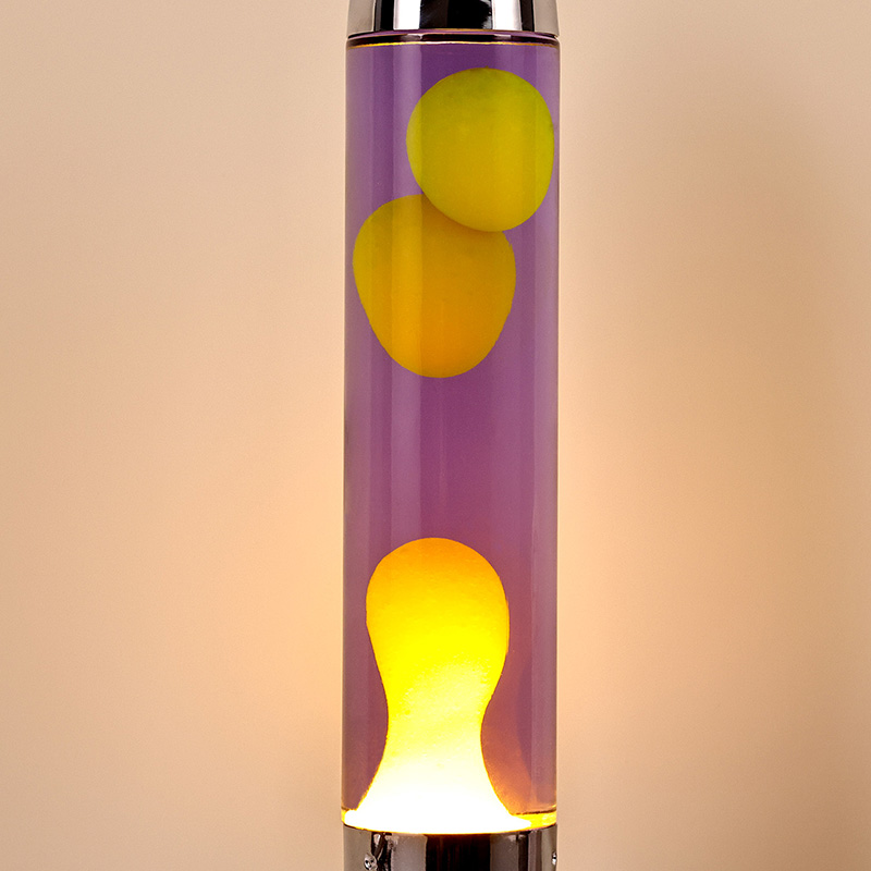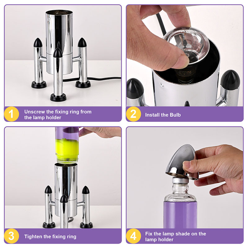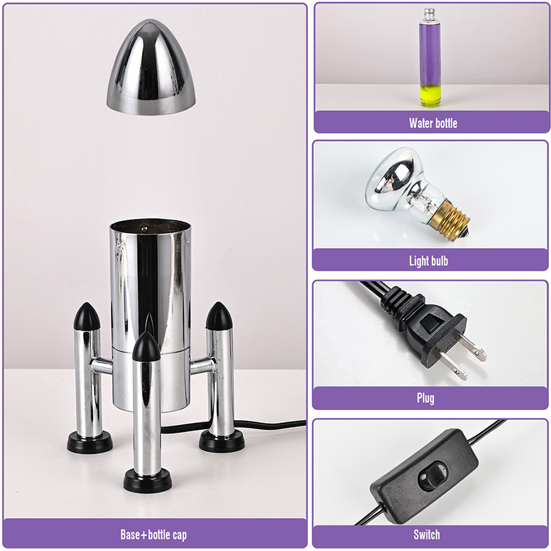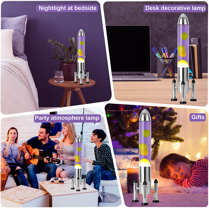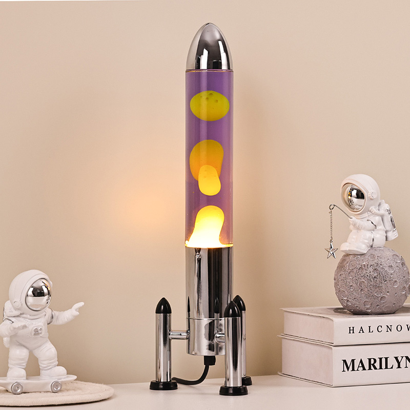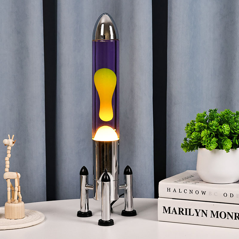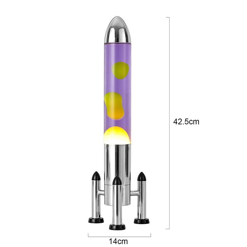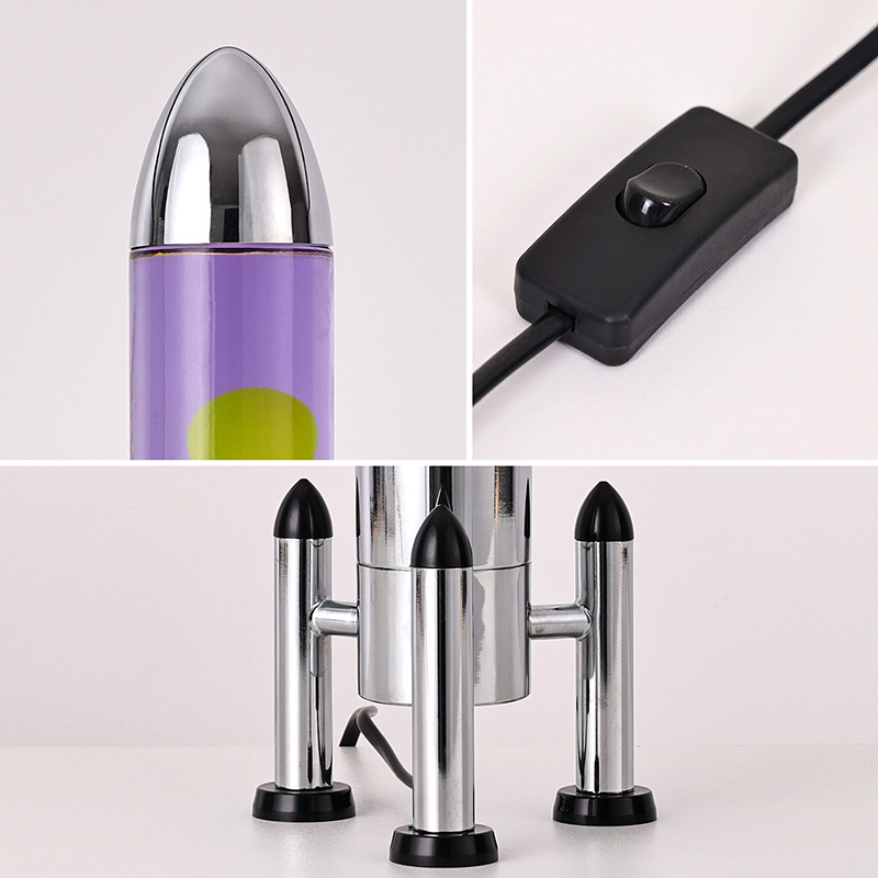 24ВВелика світлодіодна лампа Lava з ракетним абажуром має класичний дизайн у формі ракети зі сріблястим металевим корпусом у поєднанні з прозорим корпусом скляної пляшки, простий, але стильний. Жовтий плаває у фіолетовій рідині всередині