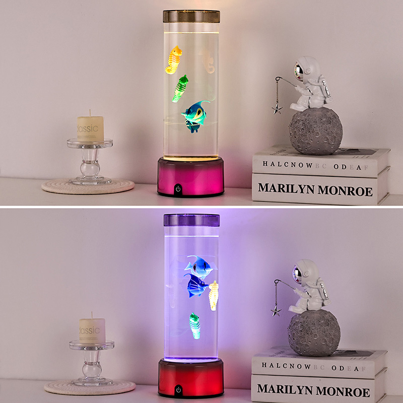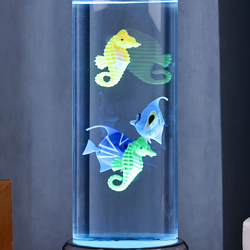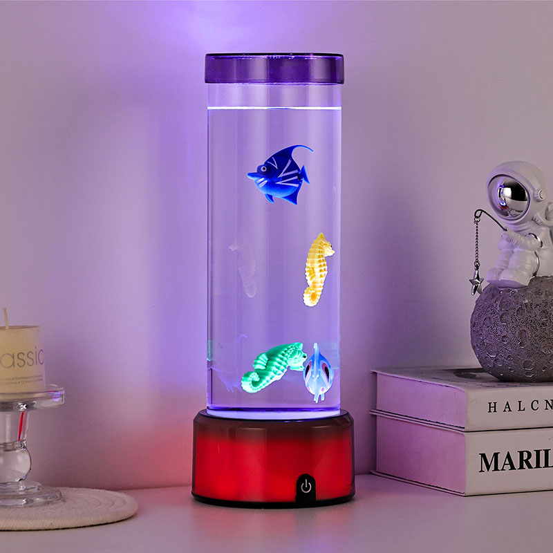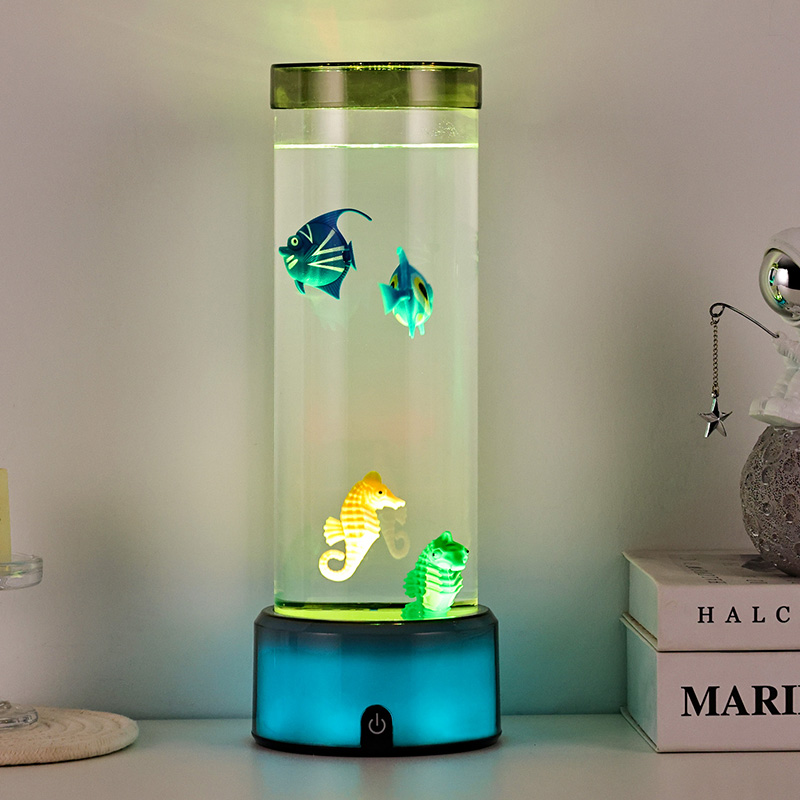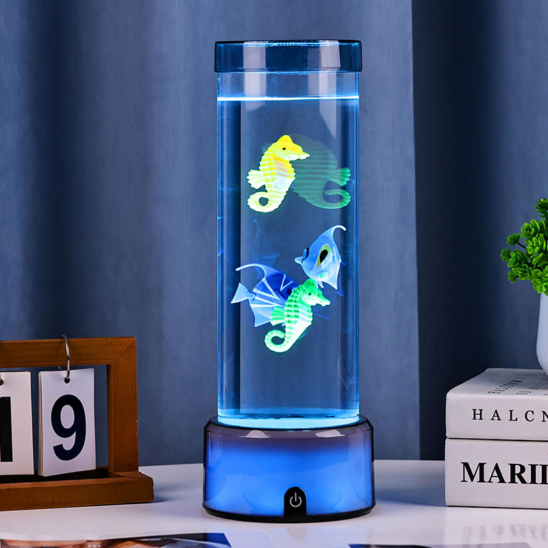 чарівність. Виготовлений із високоякісного міцного пластику, цей захоплюючий світильник має витончений циліндричний корпус, наповнений прозорою рідиною, і чудово деталізовані плаваючі фігурки риб, у тому числі яскравих тропічних рибок і чарівного морського коника, створюючи безтурботну реалістичну океанську сцену, яка приносить спокій і візуальну насолоду в будь-яку кімнату.