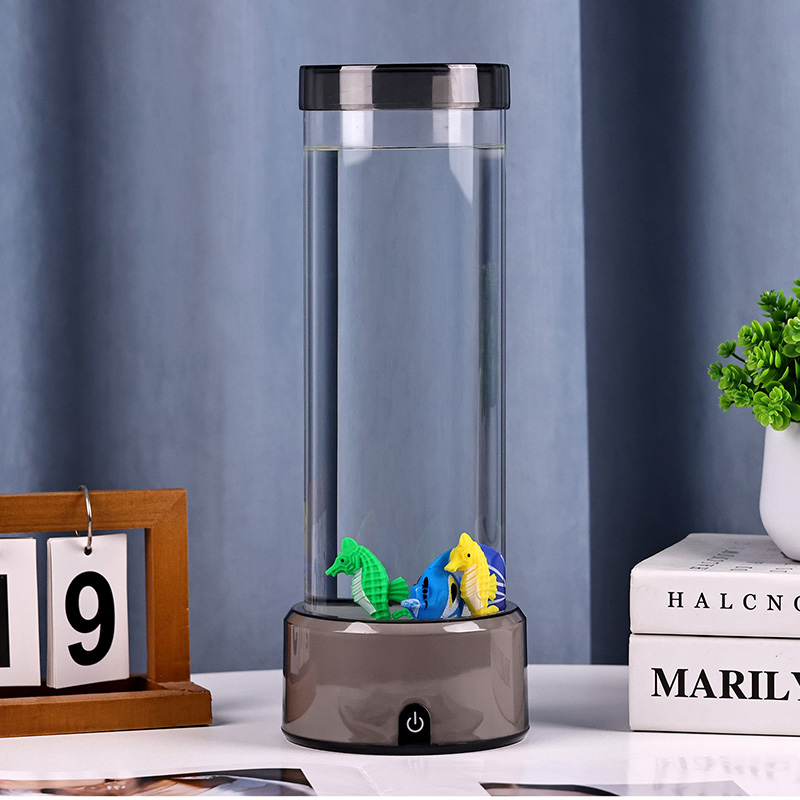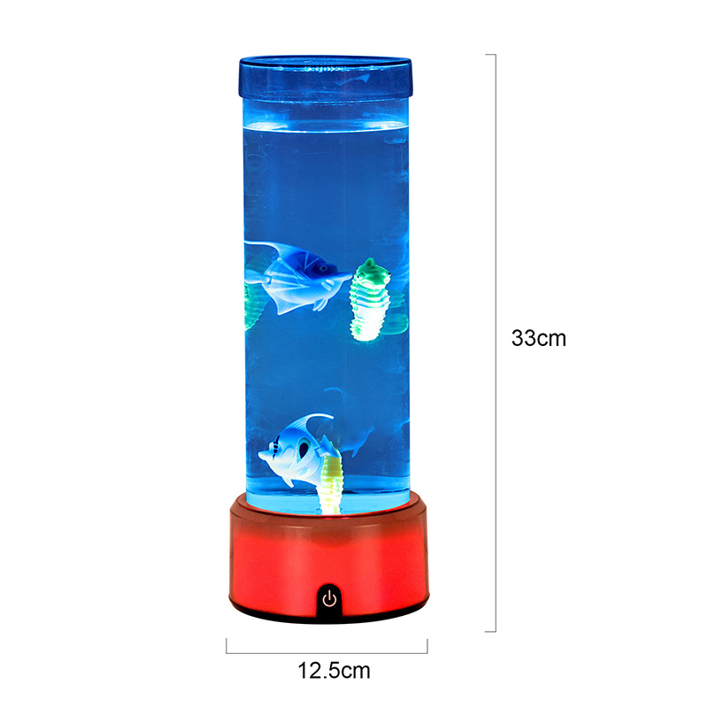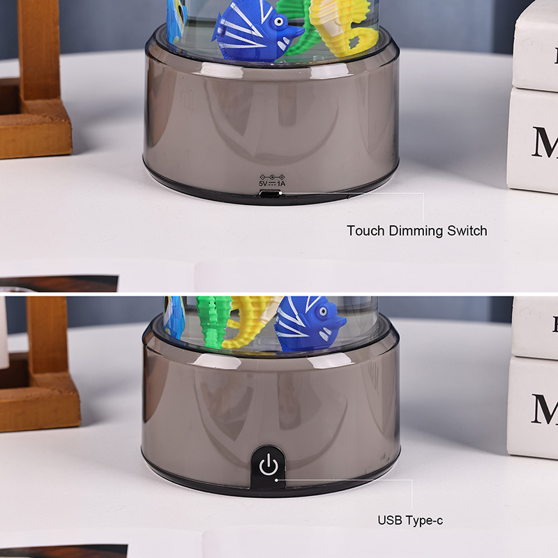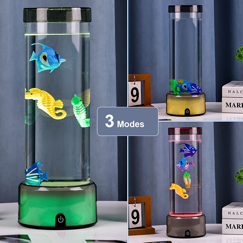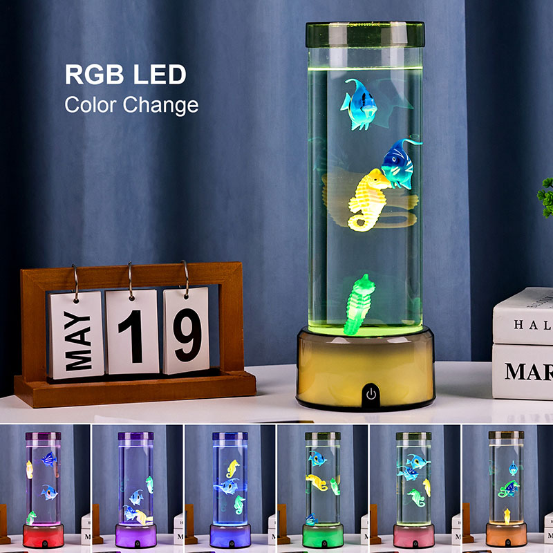 чарівність. Виготовлений із високоякісного міцного пластику, цей захоплюючий світильник має витончений циліндричний корпус, наповнений прозорою рідиною, і чудово деталізовані плаваючі фігурки риб, у тому числі яскравих тропічних рибок і чарівного морського коника, створюючи безтурботну реалістичну океанську сцену, яка приносить спокій і візуальну насолоду в будь-яку кімнату.