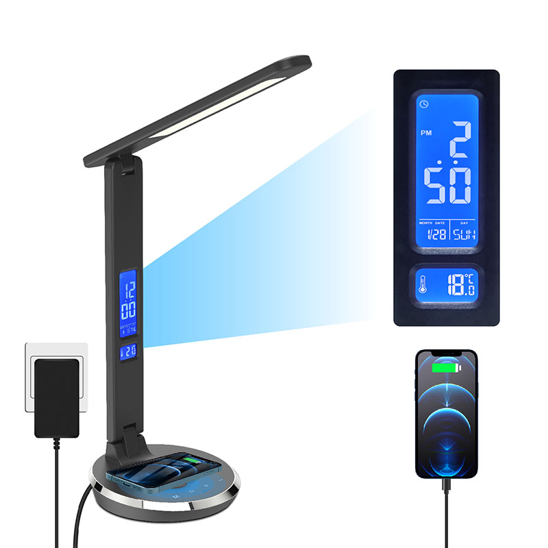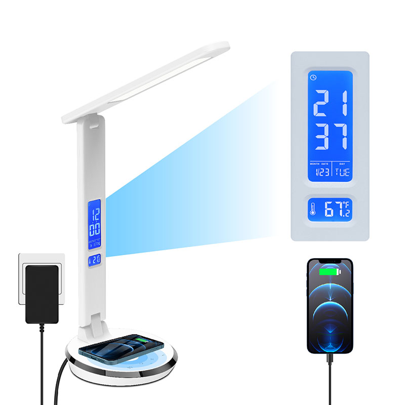 Є РК-екран з відображенням температури、Час、Будильник、Вічний календар із кнопкою керування на задній частині корпусу. А позаду плафона настільної лампи є зарядний USB-порт.