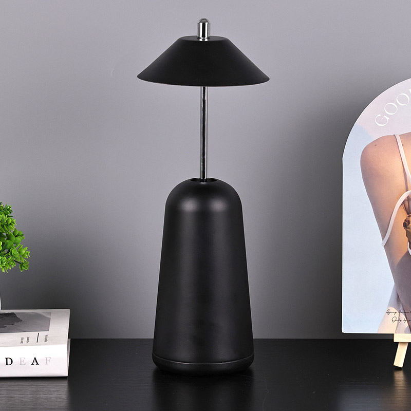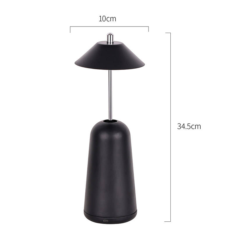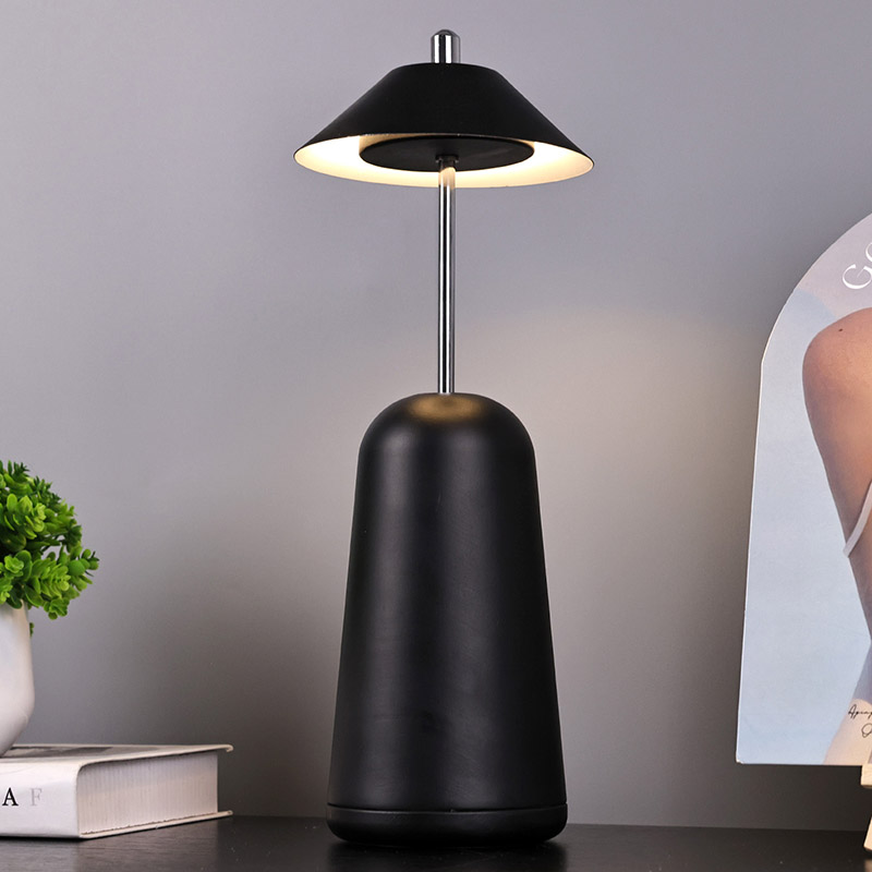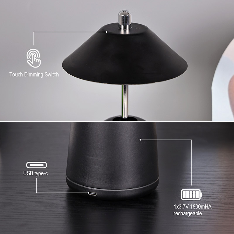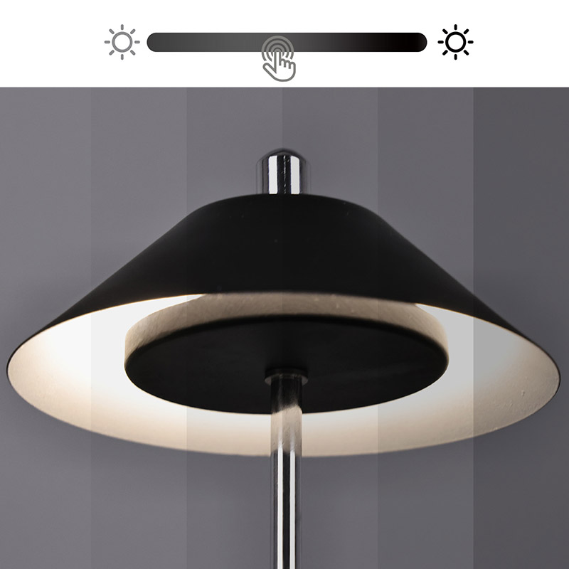 Світло сучасної світлодіодної настільної лампи з регулюваною висотою плафона врізане всередину абажура з теплими кольорами та трьома рівнями інтенсивності світла в діапазоні від 3000K до 6500K. Верхня частина абажура - це сенсорний вимикач, схожий на антену. Основа складається з неправильного циліндричного металу