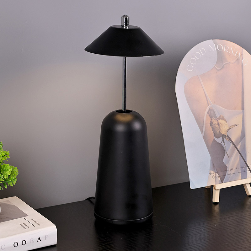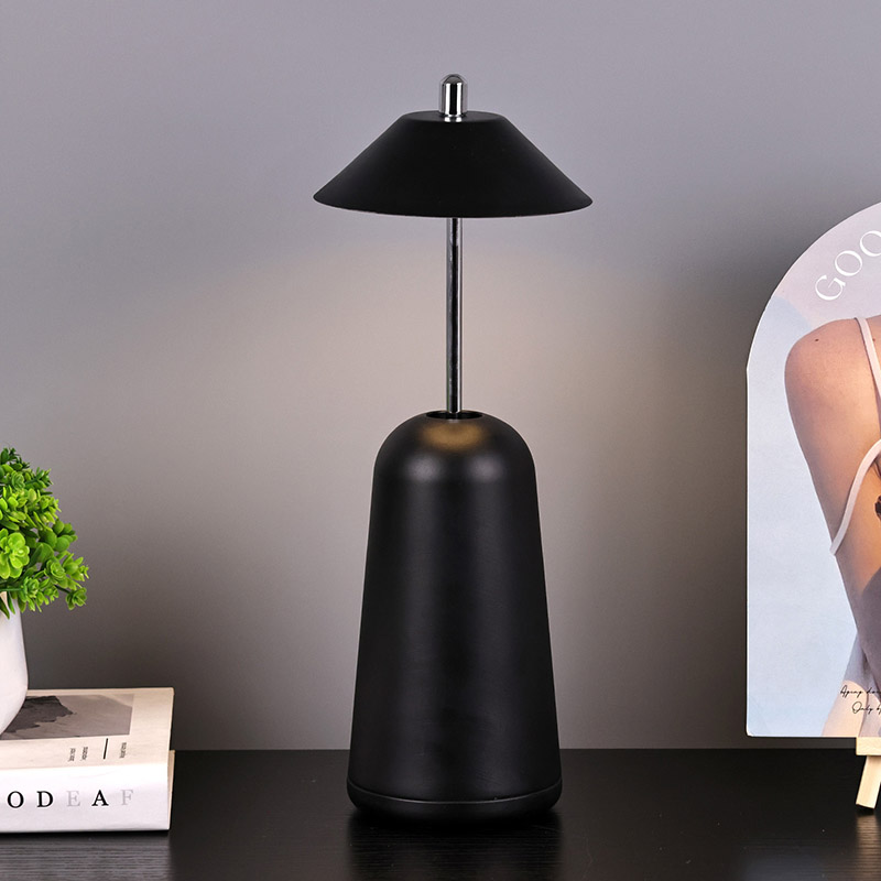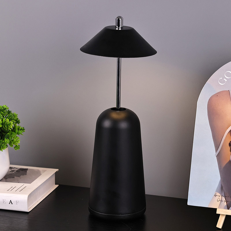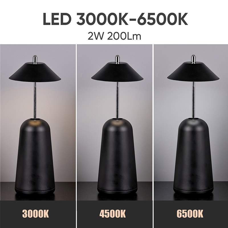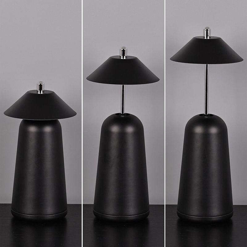 Світло сучасної світлодіодної настільної лампи з регулюваною висотою плафона врізане всередину абажура з теплими кольорами та трьома рівнями інтенсивності світла в діапазоні від 3000K до 6500K. Верхня частина абажура - це сенсорний вимикач, схожий на антену. Основа складається з неправильного циліндричного металу