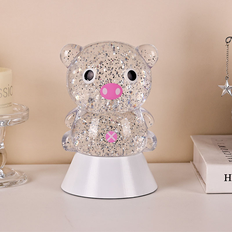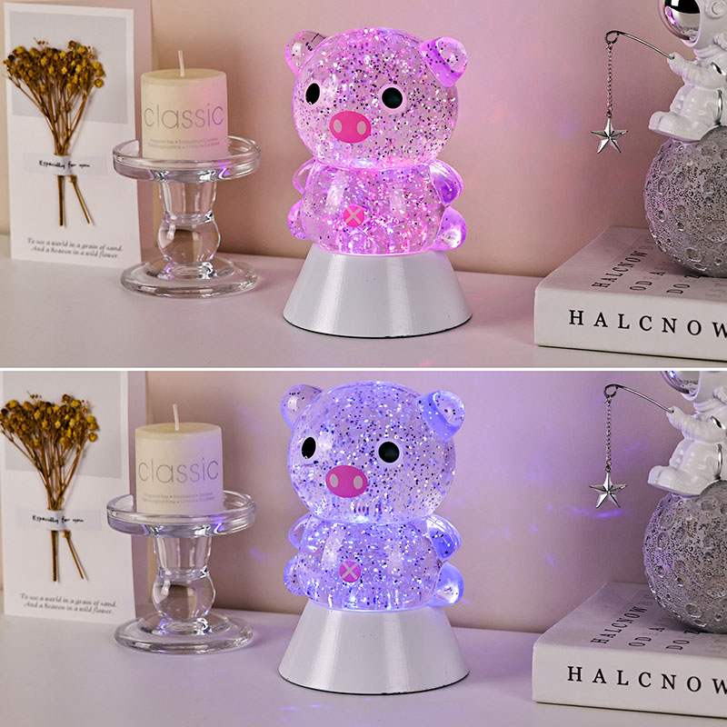 Пластик і електронікаУ затишну ніч химерний і чарівний нічник може принести нескінченне тепло та уяву в дитячу кімнату. Цей декоративний нічник у формі «Мрійної свині», створений за мотивами чарівного мультяшного дизайну свині, поєднує динамічну технологію зміни рідини з блискучими ефектами для створення креативного домашнього освітлювального продукту, який поєднує веселощі, естетику та практичність. Це ідеальний вибір для дитячих кімнат, спалень, робочих столів або як подарунок до свята.