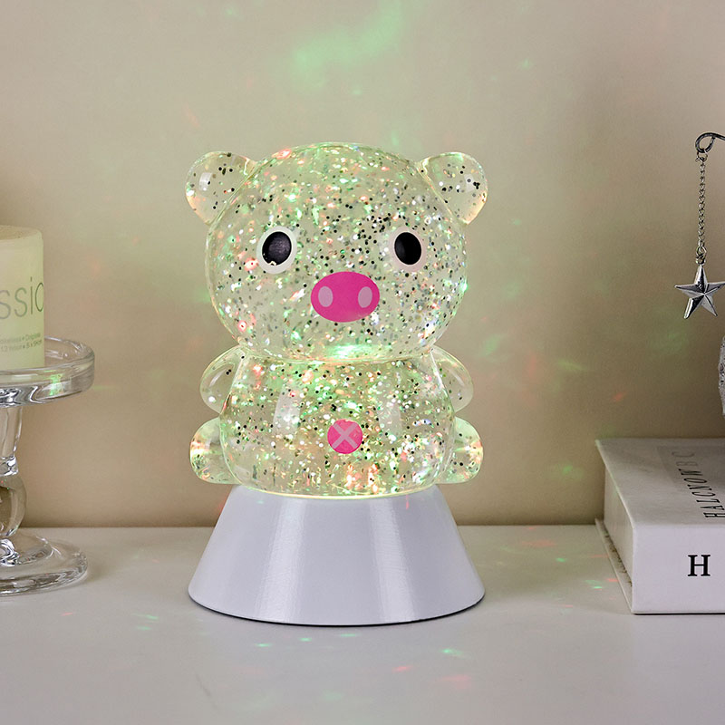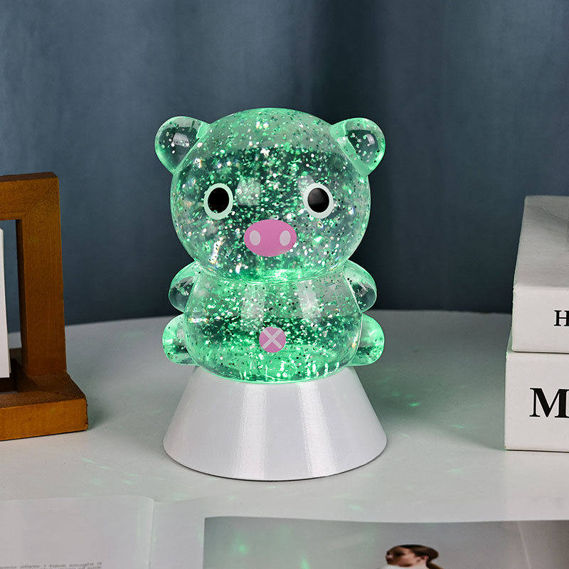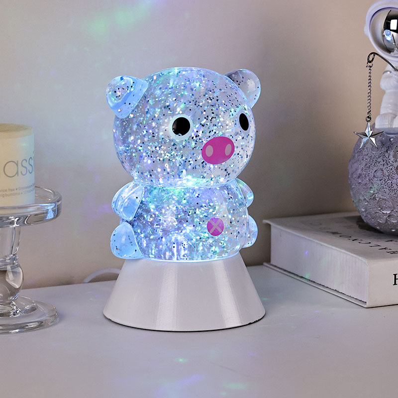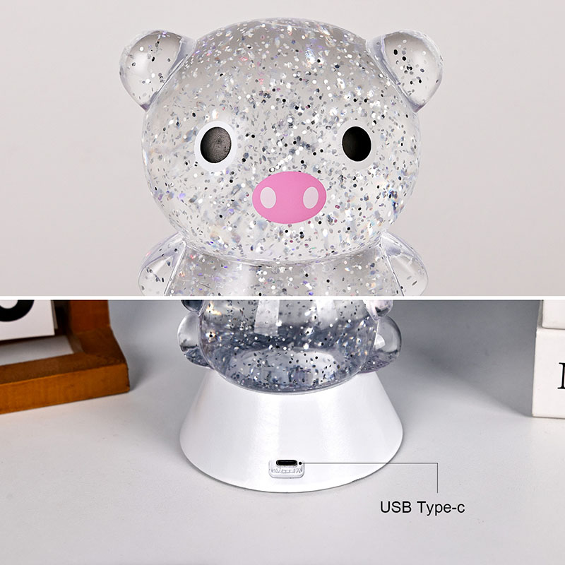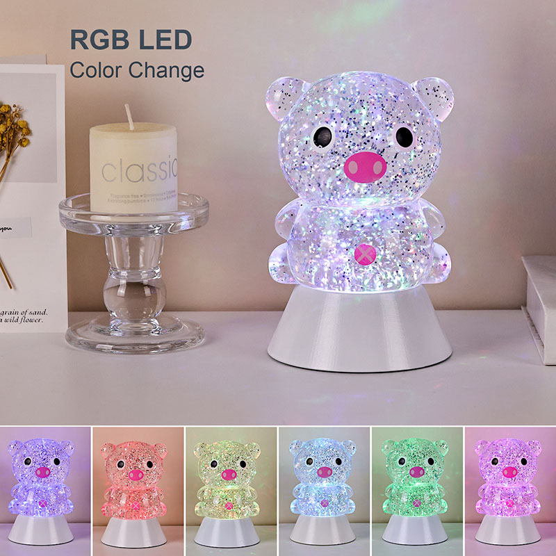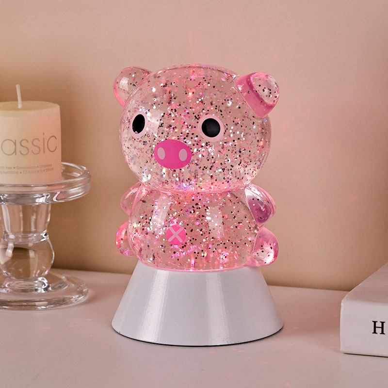 Блискуча настільна лампа RGB із відтінком свині — це не лише інструмент освітлення, але й майстерно розроблений декоративний елемент. Незалежно від того, чи слугує він заспокійливим супутнім світлом для дітей перед сном, чи як стильний акцент у кімнаті, він забезпечує чудове візуальне враження. Його ніжне, не сліпуче світіння допомагає зменшити зорову втому, допомагаючи дітям розслабитися та спокійно заснути. Водночас плавне мерехтливе світло може збудити дитячу уяву, ставши їхнім початковим супутником у дослідженні світла та кольору.