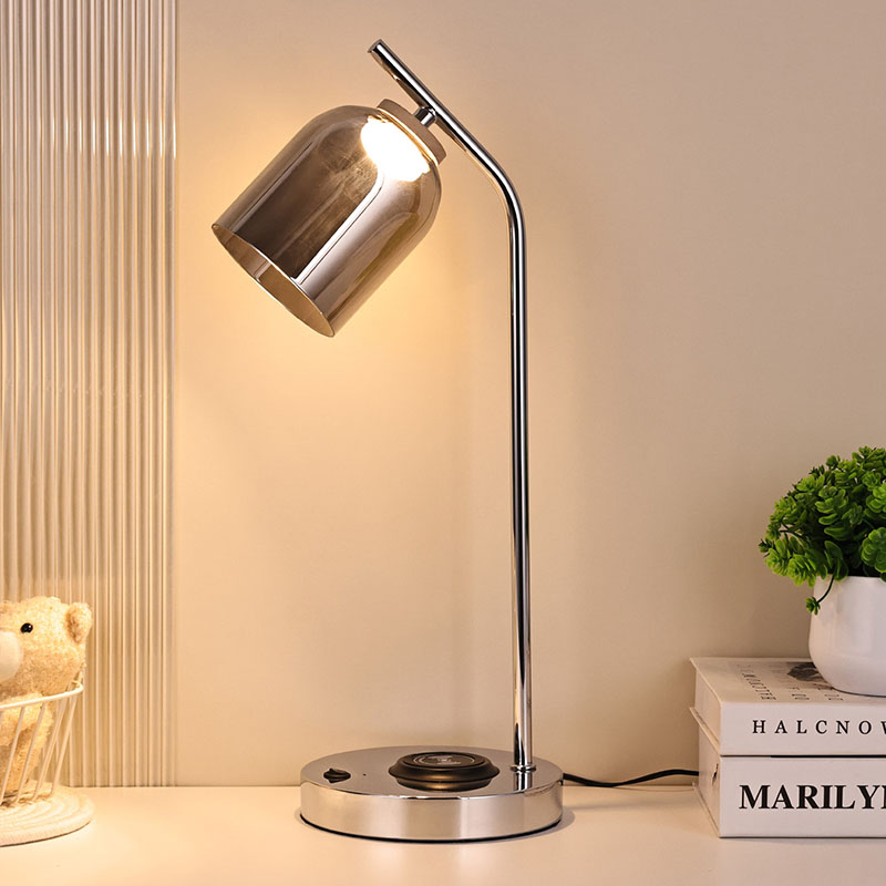 Світлодіодна настільна лампа QI зі скляним абажуром і металевою сріблястою основою та корпусом