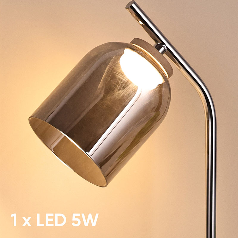Хромована основа, плафон димчастого (янтарного) склаІнноваційний дизайн, скляний матеріал, висококласний та елегантний зовнішній вигляд, дуже декоративний стиль дизайну настільної лампи